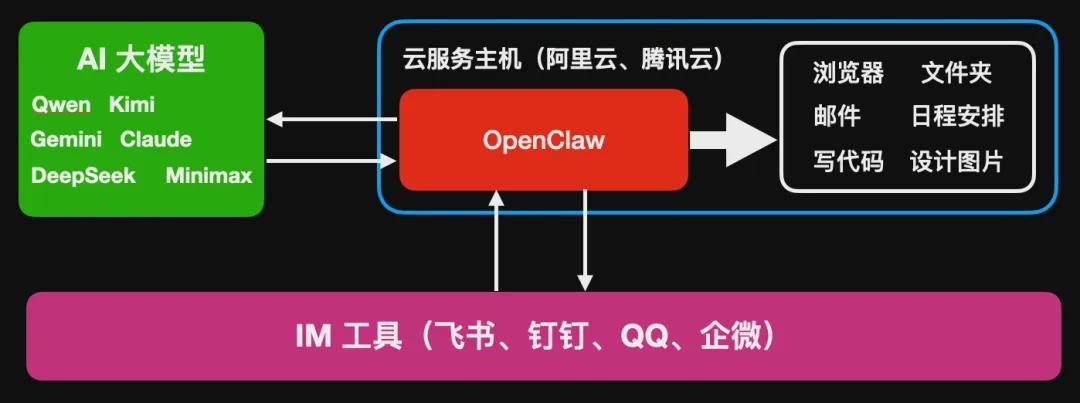 简单理解,这套机制就是三部分构成,一个 AI 大模型、一台运行 OpenClaw 的电脑、一个用来收发指令的 IM 工具。