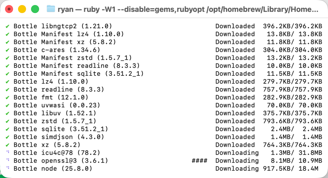 brew install node安装过程也需要一点时间,你依旧会看到一系列命令在执行过程中,稍安勿躁。