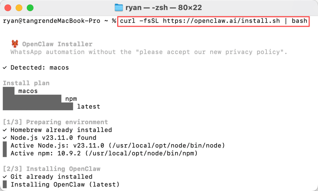 curl -fsSL https://openclaw.ai/install.sh | bash然后,你会看到安装程序启动了。