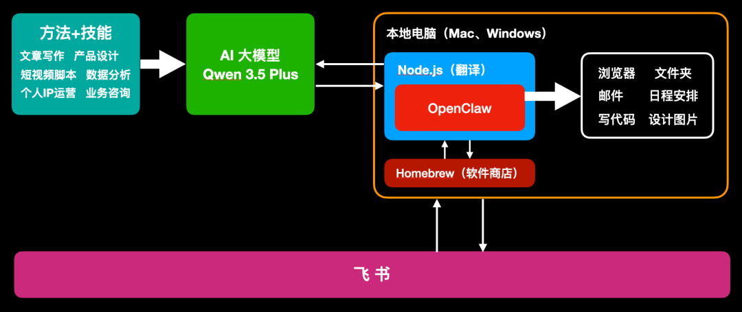 可以把 OpenClaw 看成一个外国人,这个翻译起到的作用就是把 OpenClaw 说的话翻译成我们本地电脑能看得懂的语言,然后电脑才能去执行动作。